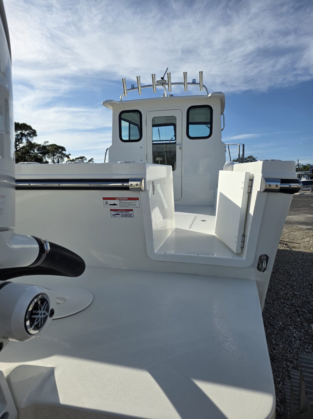 Full Transom w/ Bracket (Swim Platform & Ladder), Transom Fish box, 35 Gallon Livewell and Transom Door, Gunwale Mounted Stainless Steel Rod Holders (4)